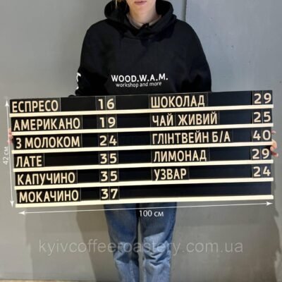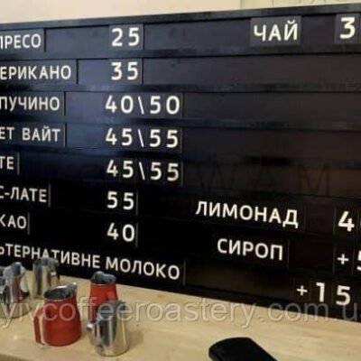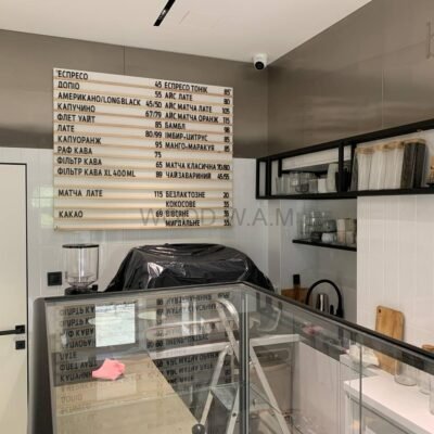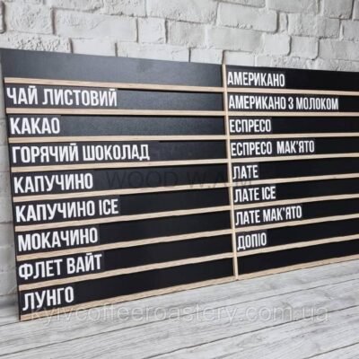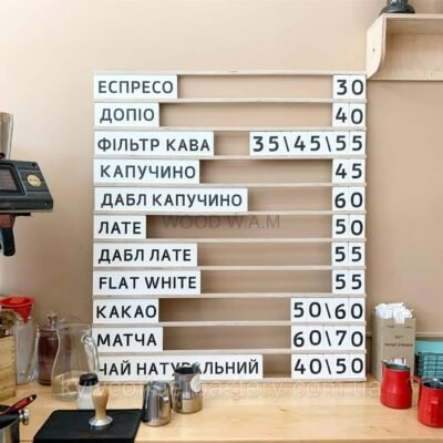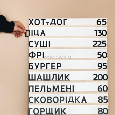 Набірне меню — це сучасний формат настінного меню, що складається з горизонтальних рейок із пазами, у які легко вставляються змінні слова та цифри. Це ідеальний варіант для закладів, які часто оновлюють асортимент або ціни.