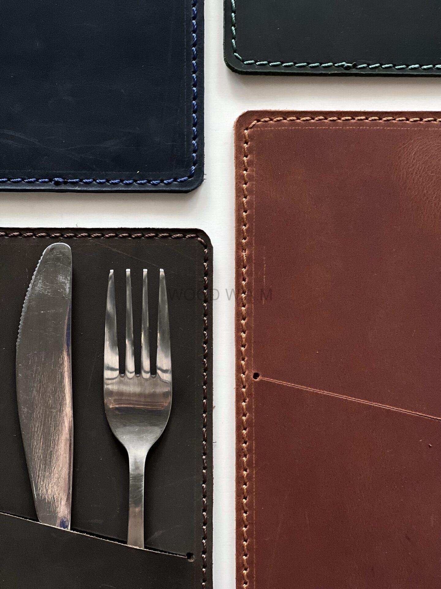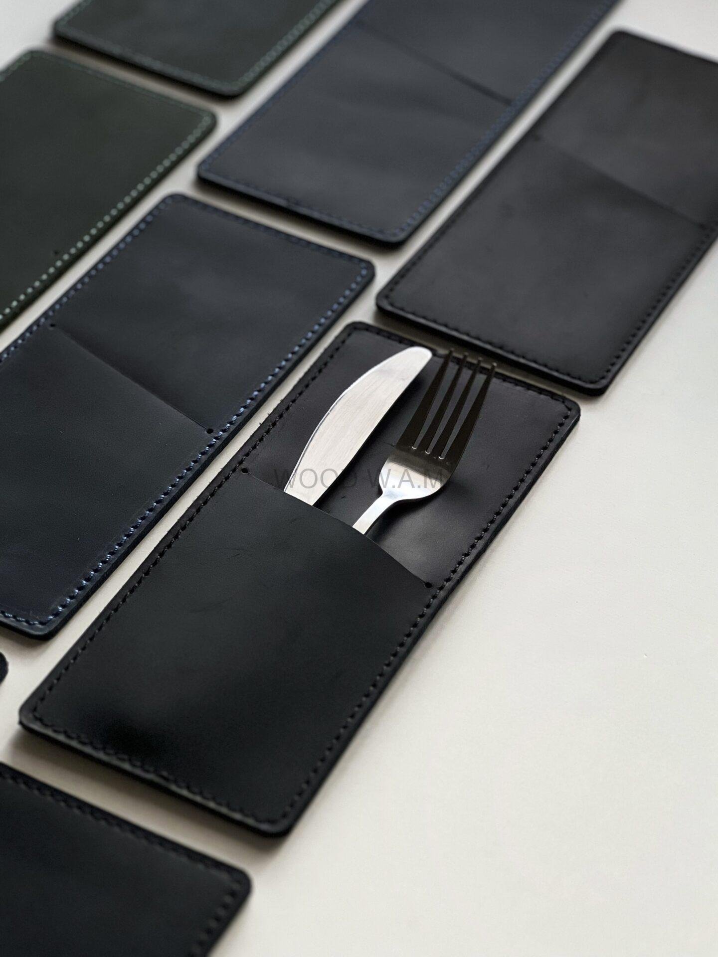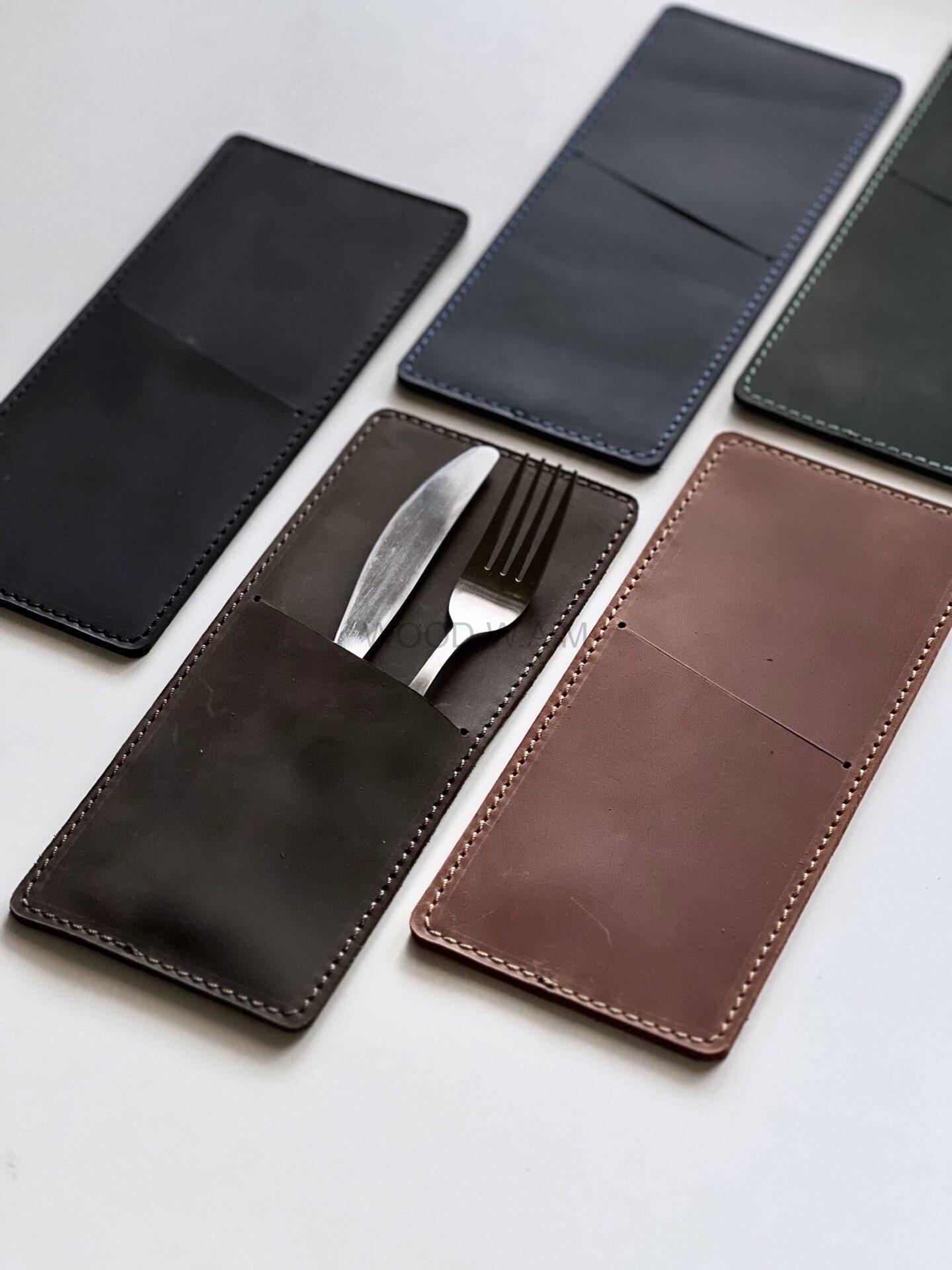Шкіряний конверт для столових приладів – це стильний та функціональний аксесуар, який допомагає організувати Ваші столові прибори з елегантністю. Виготовлений з натуральної шкіри, цей конверт поєднує в собі класичний дизайн та надійність.